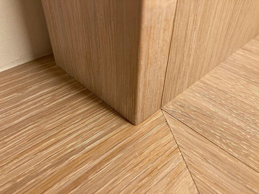 Un esprit de liberté et la nécessité de maintenir un cheminement convenable dans ce lieu de passage, ont donné naissance à un plateau de bureau en bois massif, alliant finesse et fluidité des courbes. Le tout prolongé à l’intérieur du placard, dans niche éclairée avec bloc-prises et passe-câbles.