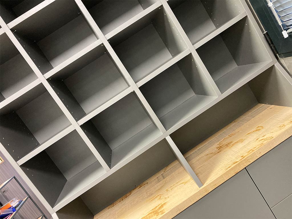 Les autres meubles sont réalisés en bois brut de sciage pour les plateaux et en mélaminé anthracite mat pour le reste de la structure.