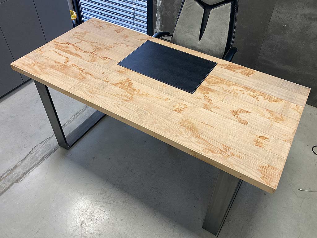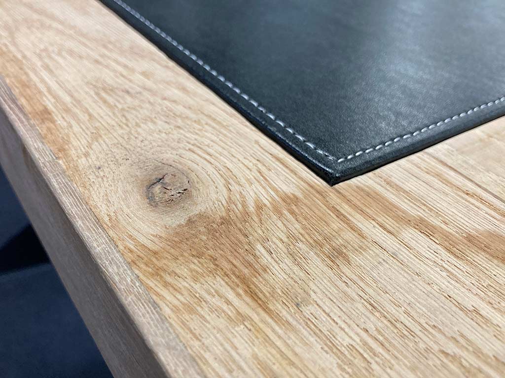 Le bureau est réalisé en bois brut de sciage avec pieds en métal et sous-main en simili cuir noir incrusté dans l’épaisseur du bois.