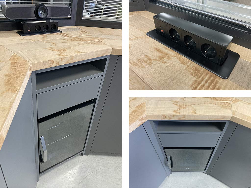 L’enfilade comprend, en son pan coupé rentrant, un frigo et un bloc électrique rétractable en métal noir avec prises 220V et USBC, neuf portes, deux tiroirs, et deux étagères réglables en hauteur pour chaque caisson.