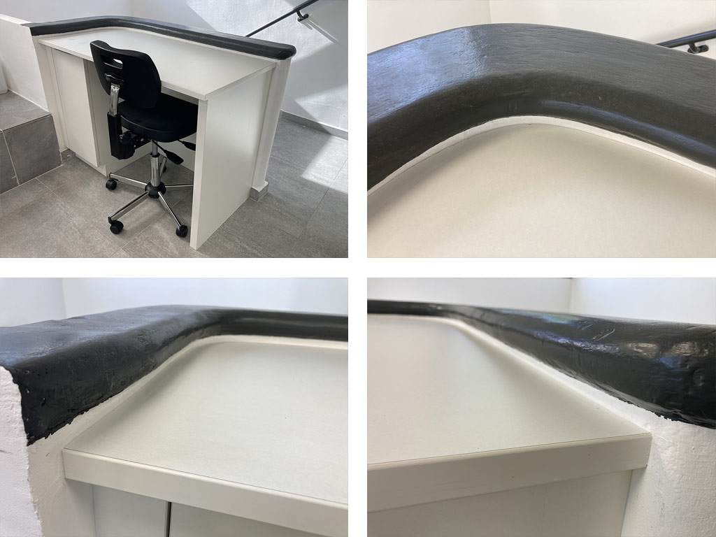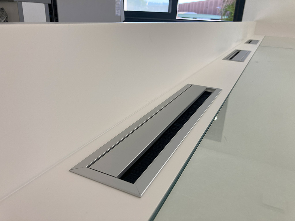 Les plateaux sont recouvert de verre trempé avec joint transparent appliqué en périphérie, afin de se prémunir d’un éventuel débordement de liquide, et d’une bande de Corian (solid surface) – avec passes-câbles en alu – au pied de la crédence, également en Corian.