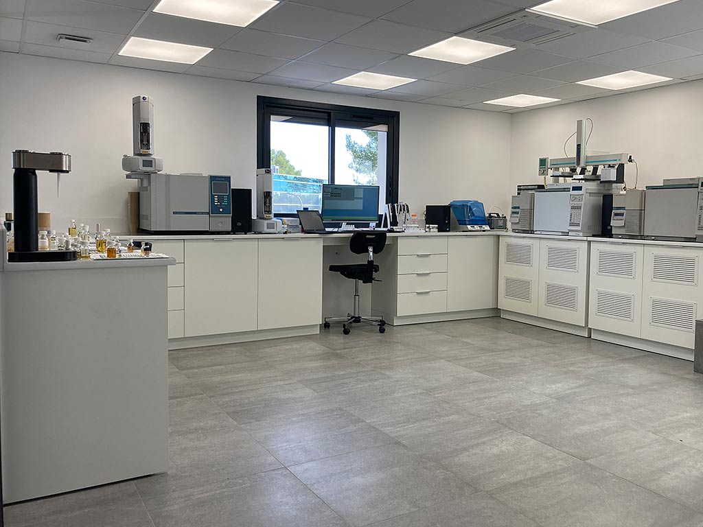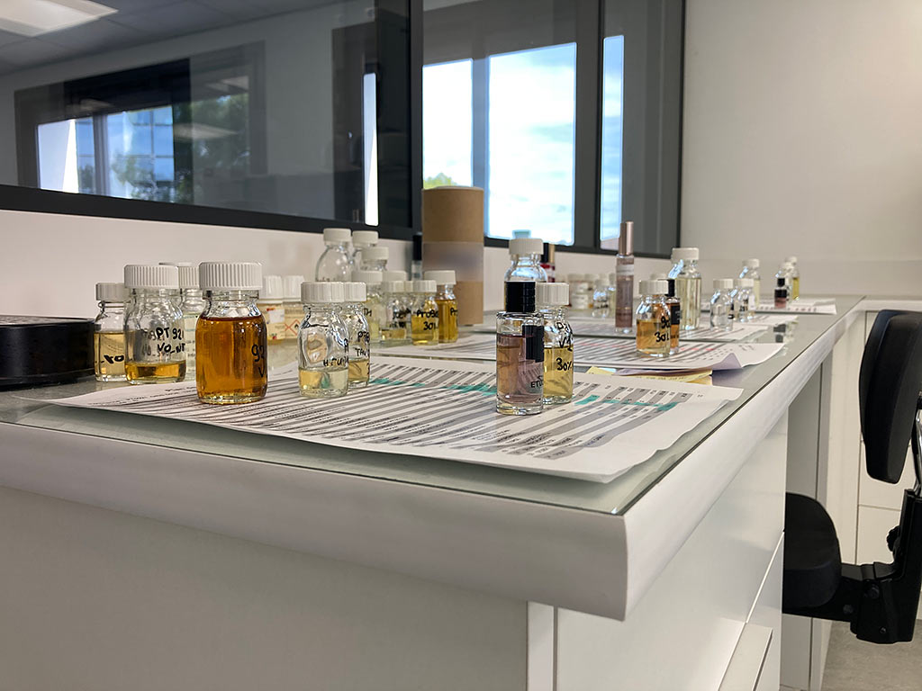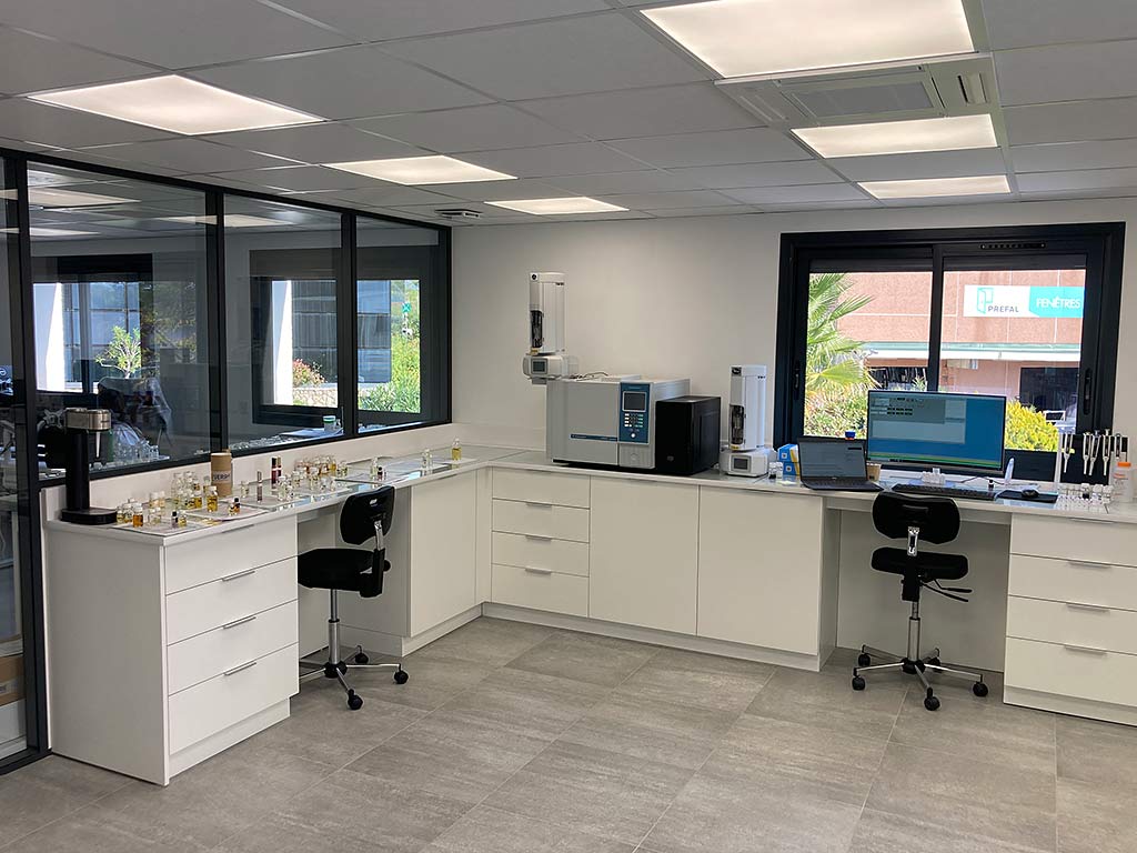 Paillasses de laboratoire de parfumerie comprenant un ensemble en U, une enfilade, un orgue de pesée à trois postes en étoile et un bureau d’appoint en angle ajusté à la forme du mur.