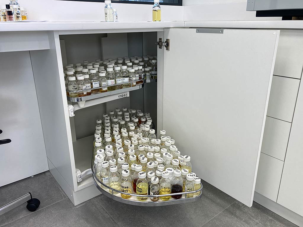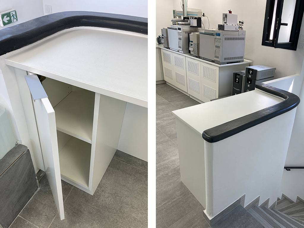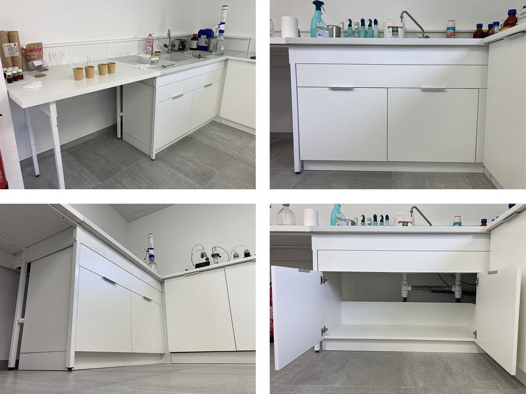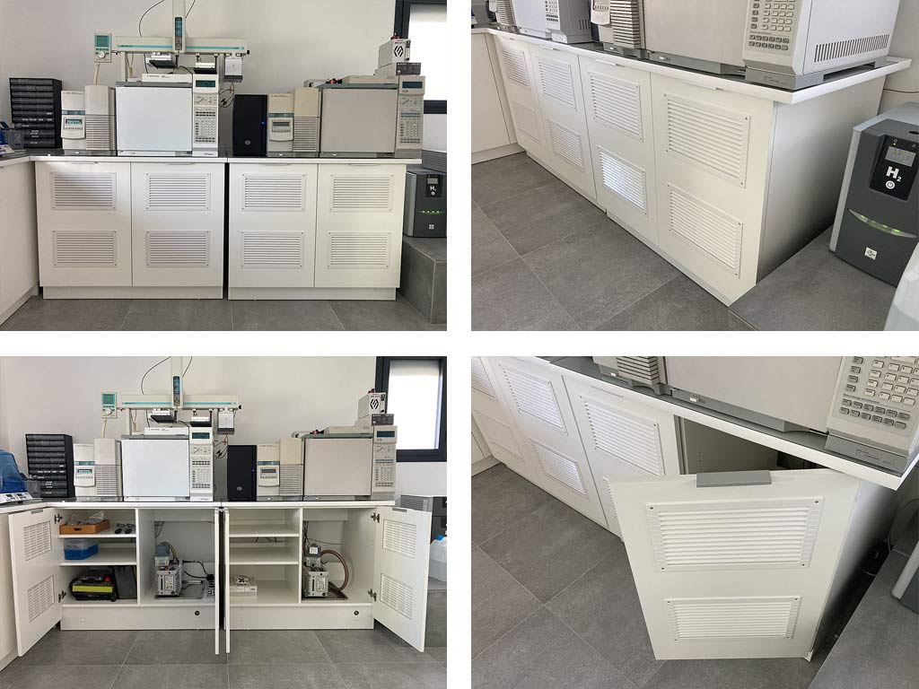 Les deux meubles supportant les appareils de chromatographie sont renforcés et équipés d’un système de roulettes invisible qui permet de les lever et de les déplacer facilement pour les phases d’entretien. Hors déplacement, les meubles reposent sur le sol afin de garantir la stabilité requise pour le bon fonctionnement des machines. Les portes sont fortement ajourées afin d’assurer le refroidissent des appareils situés à l’intérieur du meuble.