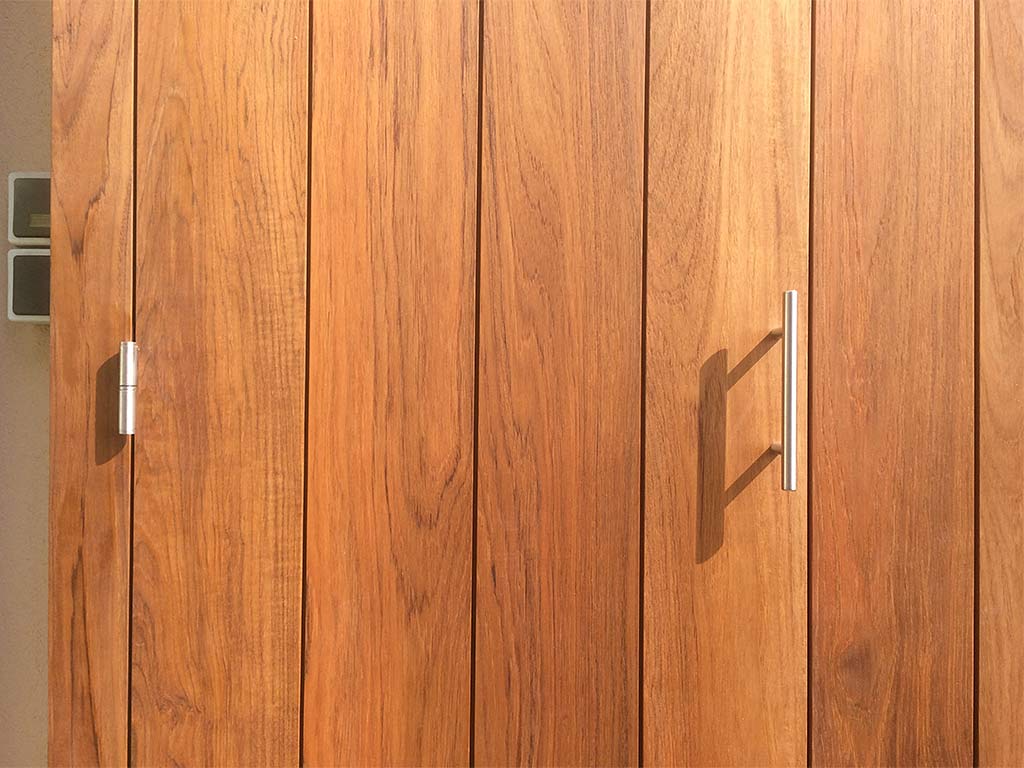 Fermeture d’espace de rangement sur mesure en teck massif, façon palissade.